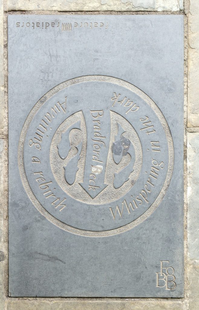 The route of Bradford Beck under the centre of Bradford is marked by 15 plaques, and this one, Awaiting a rebirth, Whispering in the dark, sponsored by Feature Radiators is No. 11 on Bank Street.