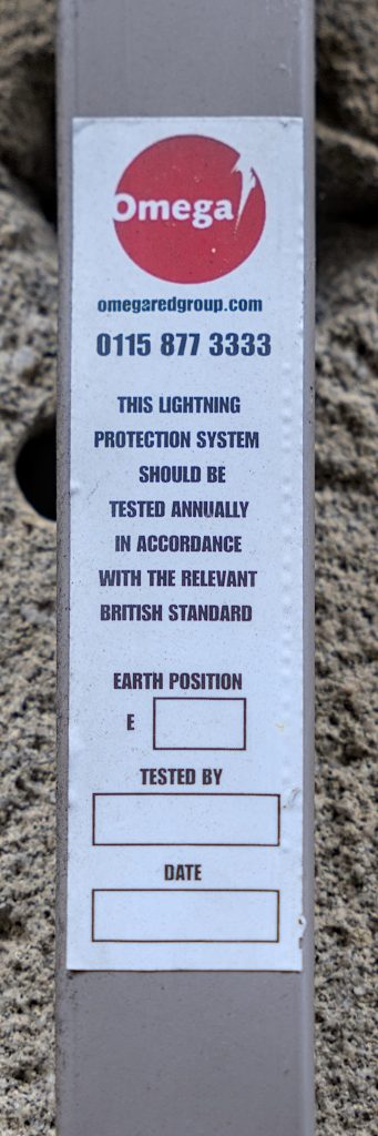 This is a lightning conductor on Albion House, 64 Vicar Lane. I wonder if it has ever been tested. Something looking like this label appeared on the building around 2014 according to Google Streetview.