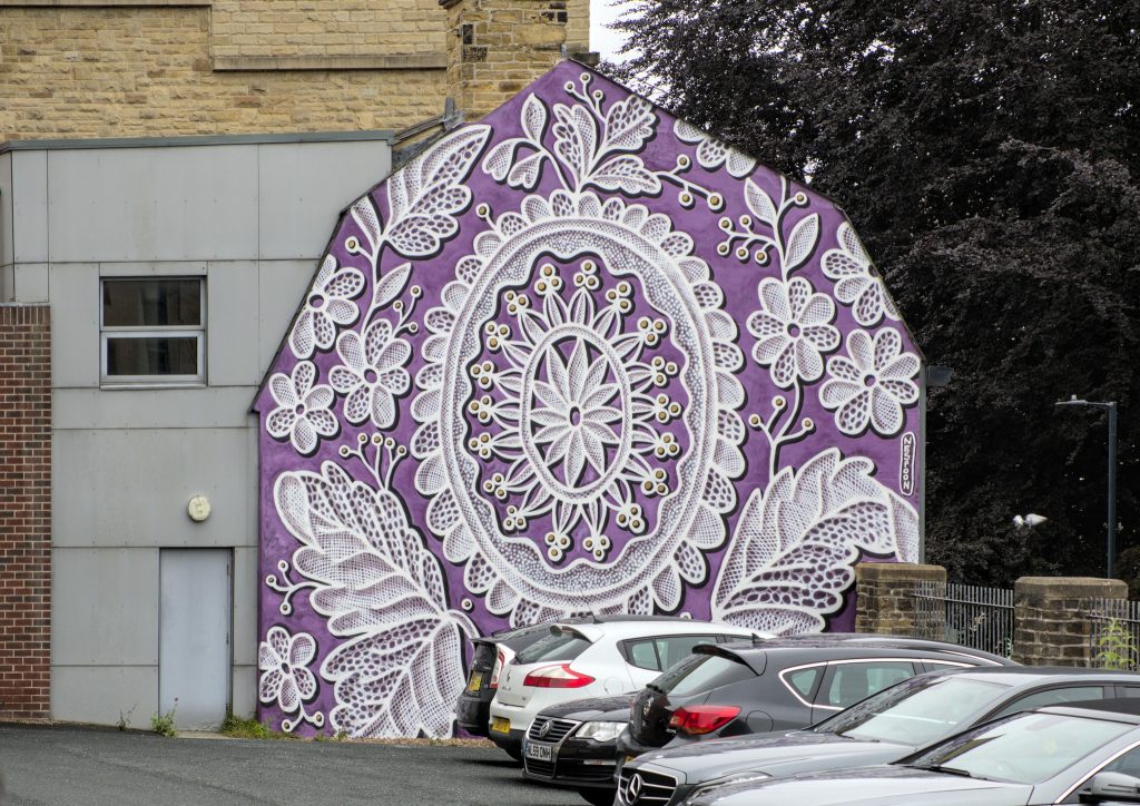 According to the NeSpoon website the inspiration for the work was a piece of lace they found in the archives of the local museum while familiarising themselves with the impressive history of the city’s textile industry. On the website it is classed as a Mural.