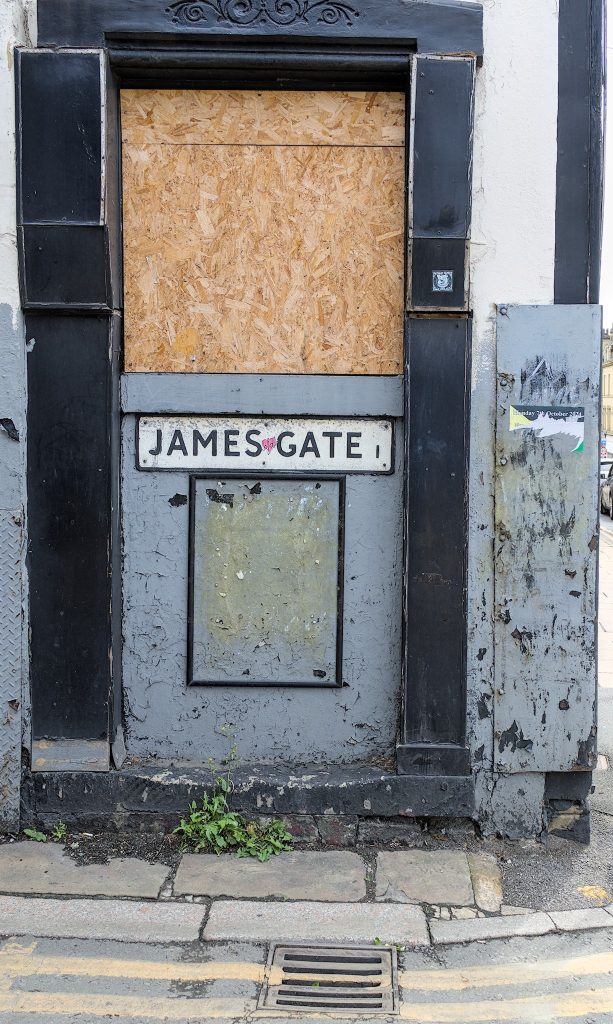 A well worn doorstep on James St. Bricked up long ago leaving a window above that has now been boarded up.