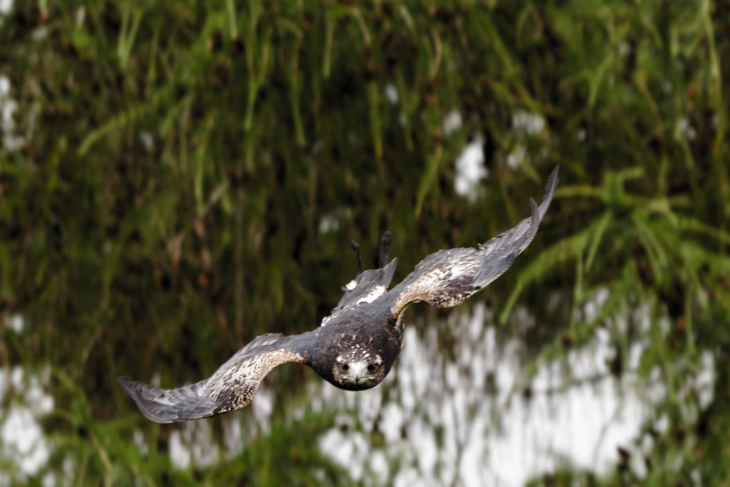 For the photographer the best way to take a photo of a birds in flight is when it is coming towards you. It is then easier to keep it in the frame but it can make focusing more difficult because the distance is continually changing. Because the bird’s motion across the frame is comparatively low you don’t need to use a high shutter speed, as a result you can get motion blur in the wings to show the movement and at the same time get a nice sharp and steady eye.