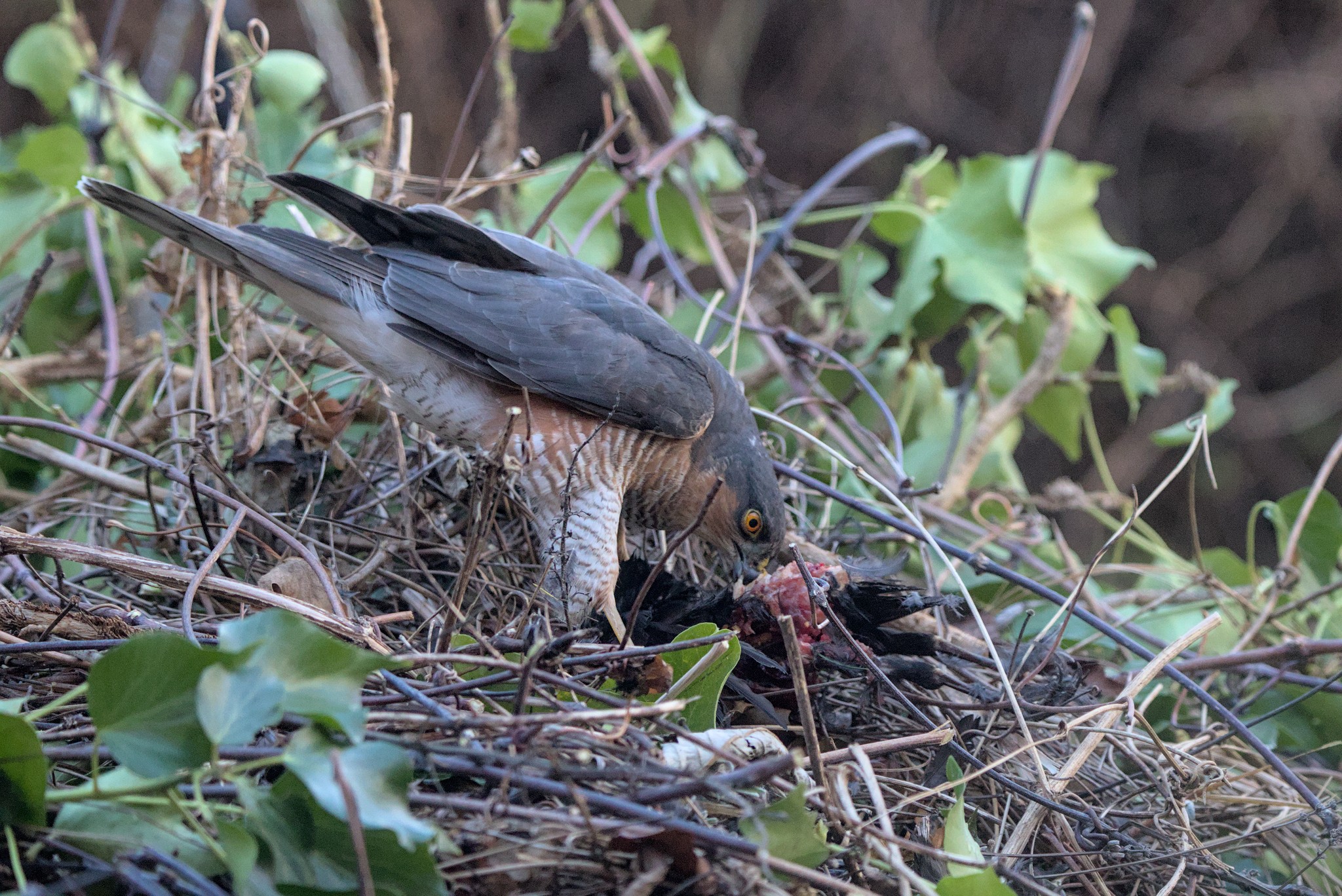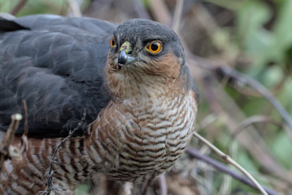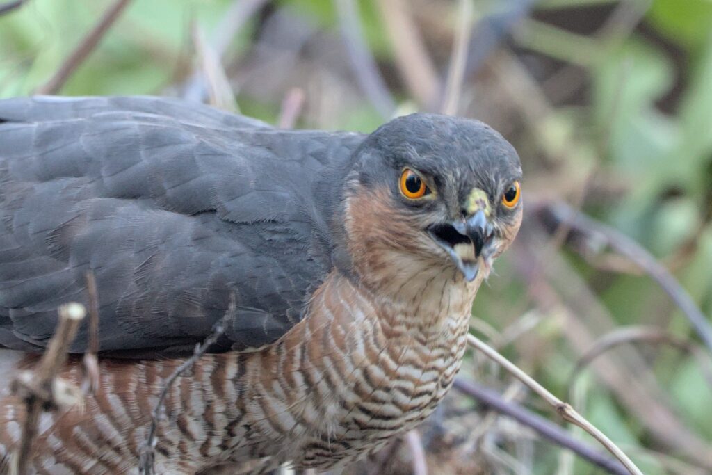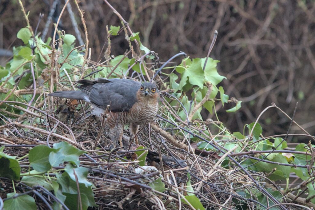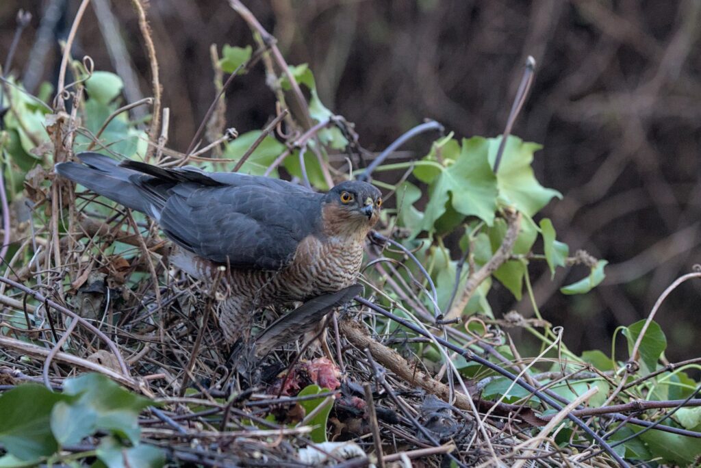 I have been doing some long overdue pruning in our garden and now have a 4 foot high mountain of stuff to get rid of. I say pruning because if it is done properly the plants get healthier, ours might not survive. I did wonder if any animals would hide in the mountain but I was a little surprised to see a black and red patch on the top of it today. It didn’t look like vegetation so I went and had a closer look. It turned out to be a rather bloody Blackbird corpse. I left it there and was rewarded within minutes with a Sparrowhawk coming in to feed.