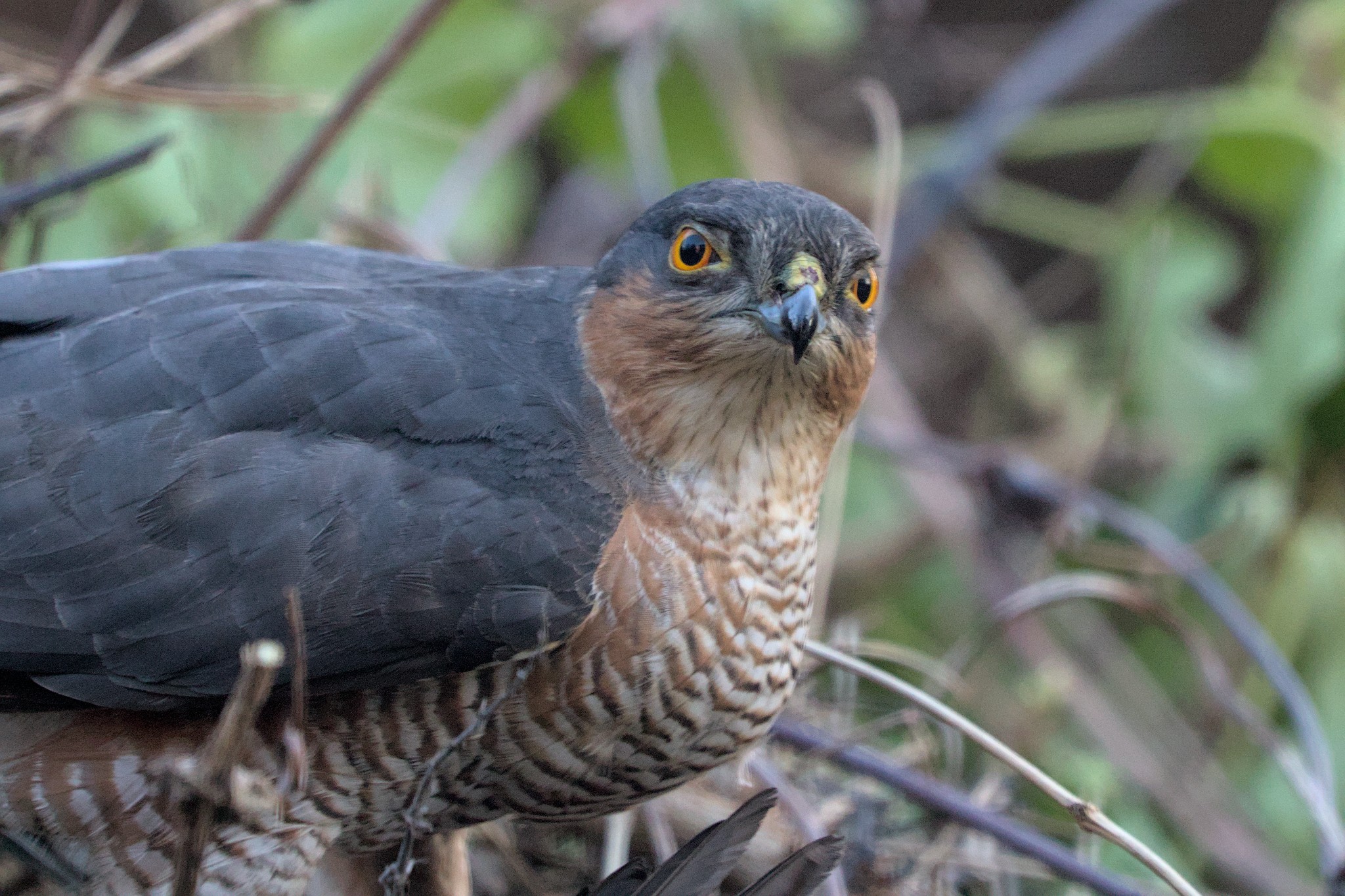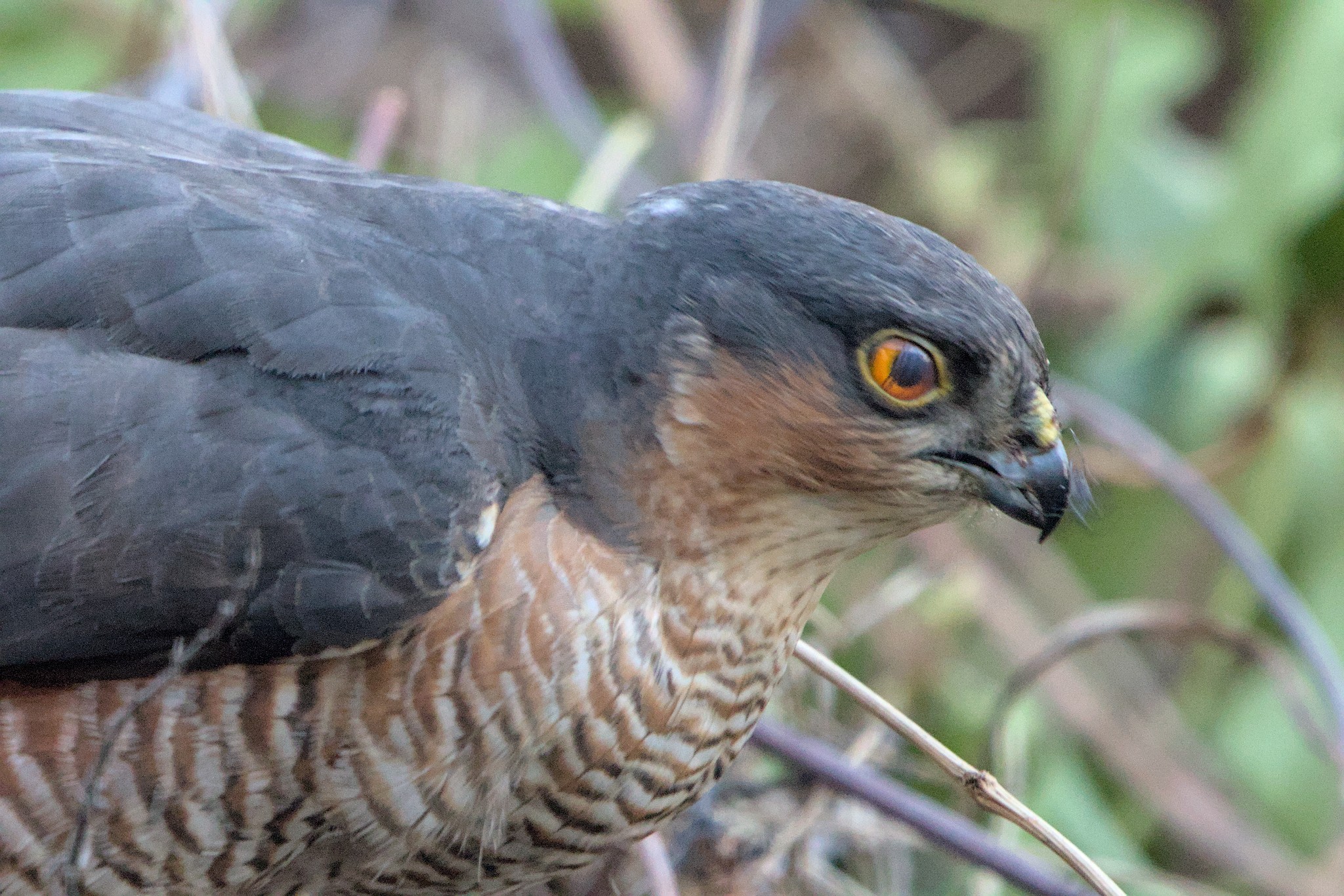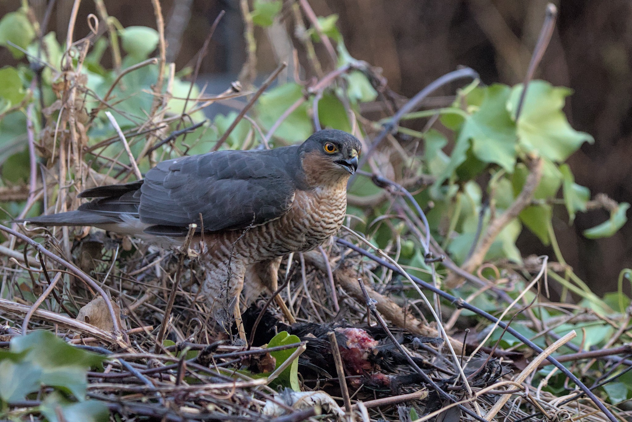 I have been doing some long overdue pruning in our garden and now have a 4 foot high mountain of stuff to get rid of. I say pruning because if it is done properly the plants get healthier, ours might not survive. I did wonder if any animals would hide in the mountain but I was a little surprised to see a black and red patch on the top of it today. It didn’t look like vegetation so I went and had a closer look. It turned out to be a rather bloody Blackbird corpse. I left it there and was rewarded within minutes with a Sparrowhawk coming in to feed.